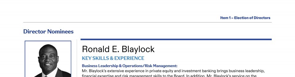 Review our Director nominees' biographies, key skills and experience, committee memberships and more in our interactive