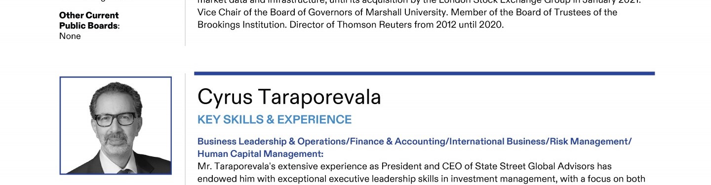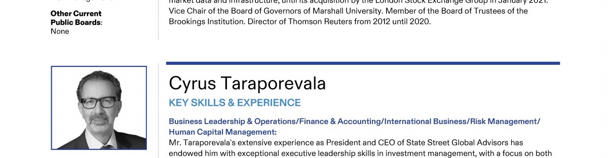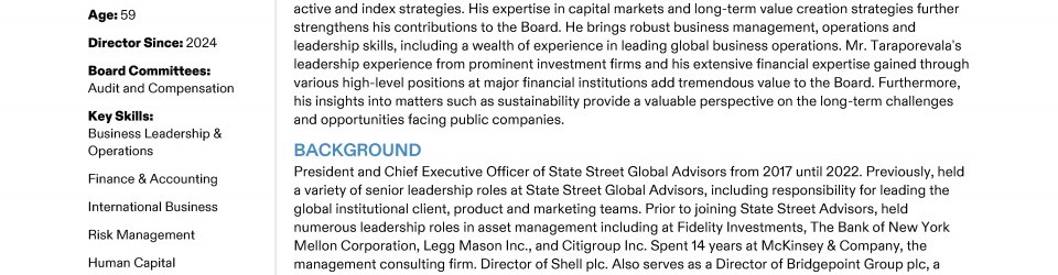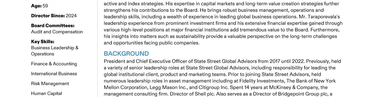 Review our Director nominees' biographies, key skills and experience, committee memberships and more in our interactive