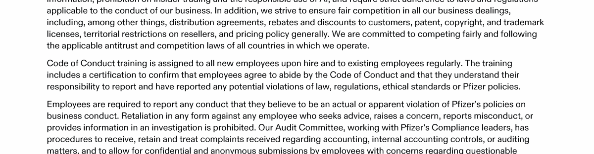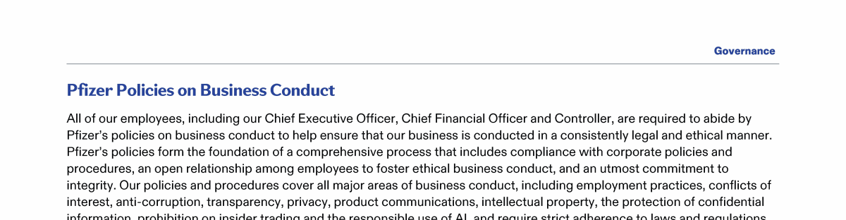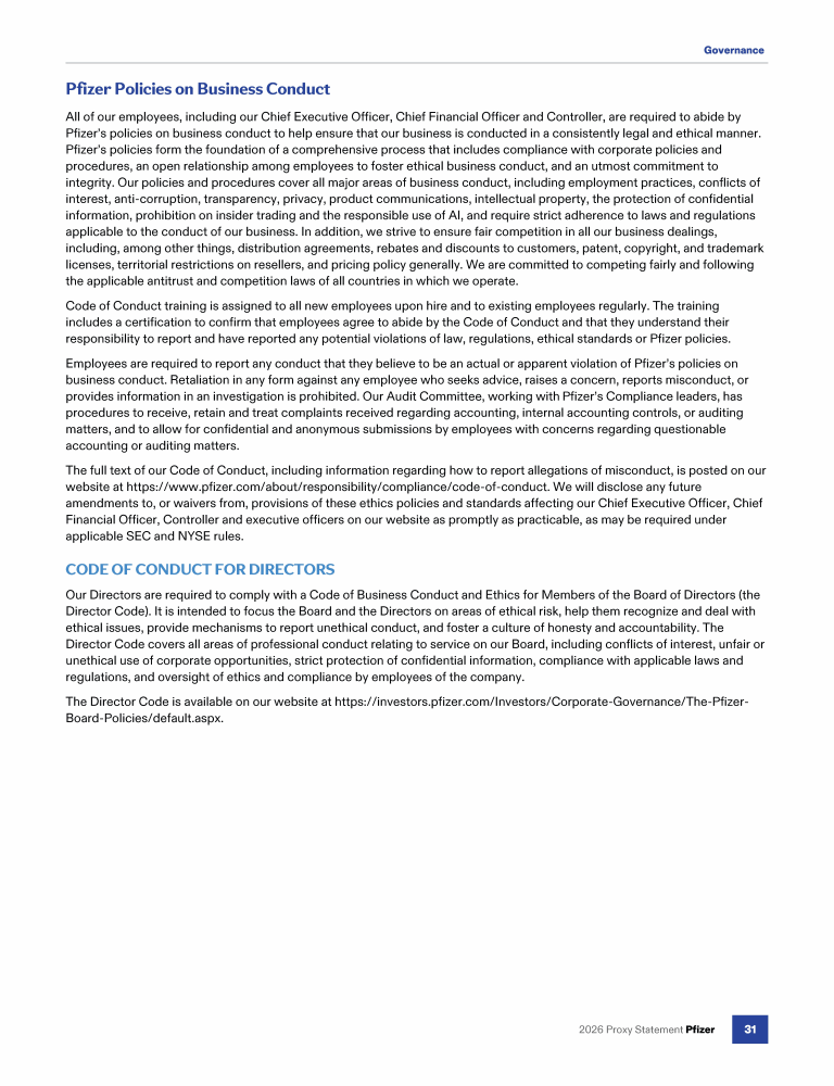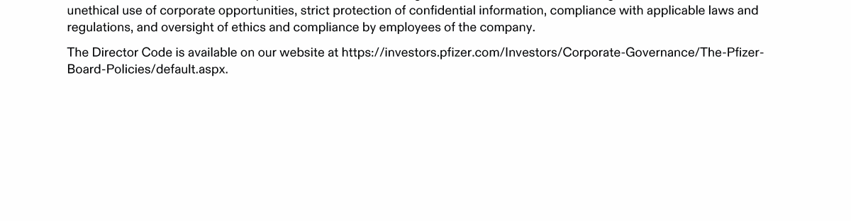 Click here to go to www.pfizer.com/about/responsibility/compliance/code-of-conduct Click here to go to www.pfizer.com/about/responsibility/compliance/code-of-conduct Click here to go to www.pfizer.com/about/responsibility/compliance/code-of-conduct Click here to go to investors.pfizer.com/Investors/Corporate-Governance/The-Pfizer-Board-Policies/default.aspx Click here to go to investors.pfizer.com/Investors/Corporate-Governance/The-Pfizer-Board-Policies/default.aspx Click here to go to investors.pfizer.com/Investors/Corporate-Governance/The-Pfizer-Board-Policies/default.aspx Click here to go to investors.pfizer.com/Investors/Corporate-Governance/The-Pfizer-Board-Policies/default.aspx Click here to go to investors.pfizer.com/Investors/Corporate-Governance/The-Pfizer-Board-Policies/default.aspx Click here to go to investors.pfizer.com/Investors/Corporate-Governance/The-Pfizer-Board-Policies/default.aspx Click here to go to www.pfizer.com/about/responsibility/compliance/code-of-conduct Click here to go to investors.pfizer.com/Investors/Corporate-Governance/The-Pfizer-Board-Policies/default.aspx Click here to go to investors.pfizer.com/Investors/Corporate-Governance/The-Pfizer-Board-Policies/default.aspx Click here to go to www.pfizer.com/about/responsibility/compliance/code-of-conduct Click here to go to investors.pfizer.com/Investors/Corporate-Governance/The-Pfizer-Board-Policies/default.aspx Click here to go to investors.pfizer.com/Investors/Corporate-Governance/The-Pfizer-Board-Policies/default.aspx