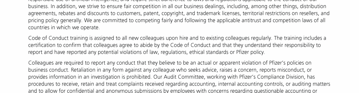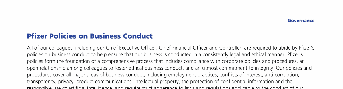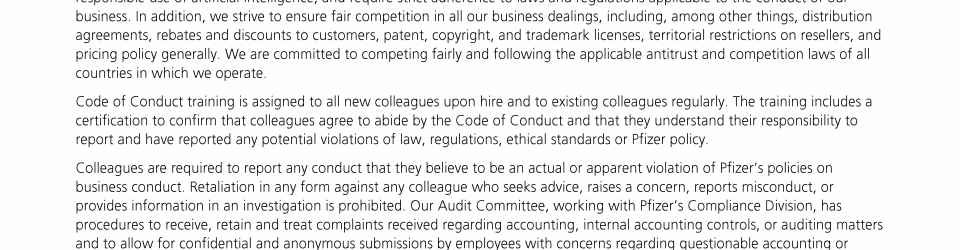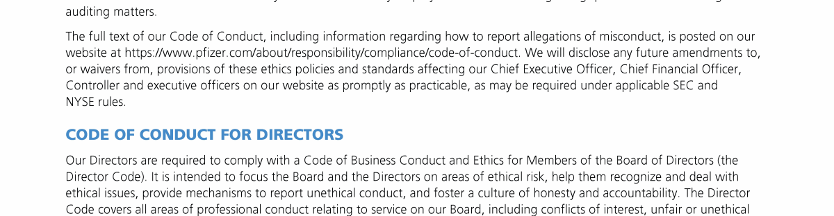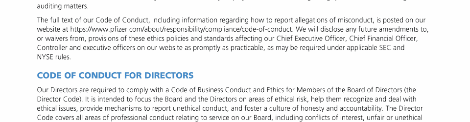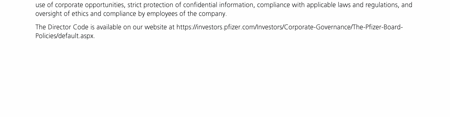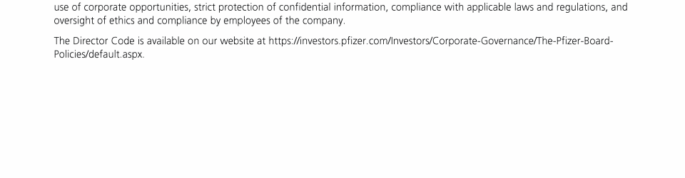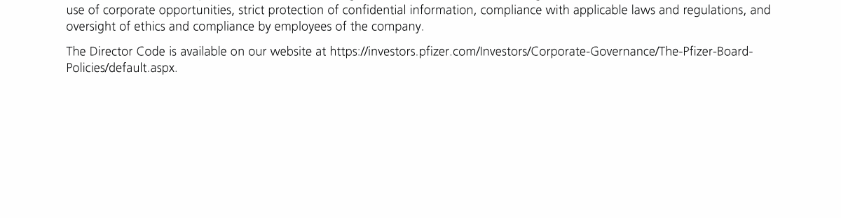 Click here to go to www.pfizer.com/about/responsibility/compliance/code-of-conduct Click here to go to www.pfizer.com/about/responsibility/compliance/code-of-conduct Click here to go to www.pfizer.com/about/responsibility/compliance/code-of-conduct Click here to go to investors.pfizer.com/Investors/Corporate-Governance/The-Pfizer-Board-Policies/default.aspx Click here to go to investors.pfizer.com/Investors/Corporate-Governance/The-Pfizer-Board-Policies/default.aspx Click here to go to investors.pfizer.com/Investors/Corporate-Governance/The-Pfizer-Board-Policies/default.aspx Click here to go to investors.pfizer.com/Investors/Corporate-Governance/The-Pfizer-Board-Policies/default.aspx Click here to go to investors.pfizer.com/Investors/Corporate-Governance/The-Pfizer-Board-Policies/default.aspx Click here to go to investors.pfizer.com/Investors/Corporate-Governance/The-Pfizer-Board-Policies/default.aspx Click here to go to www.pfizer.com/about/responsibility/compliance/code-of-conduct Click here to go to investors.pfizer.com/Investors/Corporate-Governance/The-Pfizer-Board-Policies/default.aspx Click here to go to investors.pfizer.com/Investors/Corporate-Governance/The-Pfizer-Board-Policies/default.aspx Click here to go to www.pfizer.com/about/responsibility/compliance/code-of-conduct Click here to go to investors.pfizer.com/Investors/Corporate-Governance/The-Pfizer-Board-Policies/default.aspx Click here to go to investors.pfizer.com/Investors/Corporate-Governance/The-Pfizer-Board-Policies/default.aspx