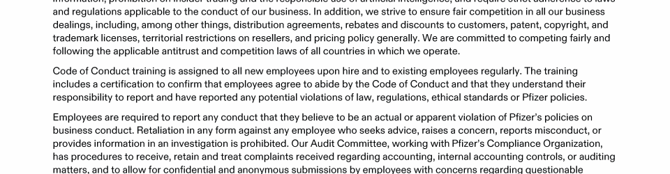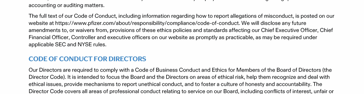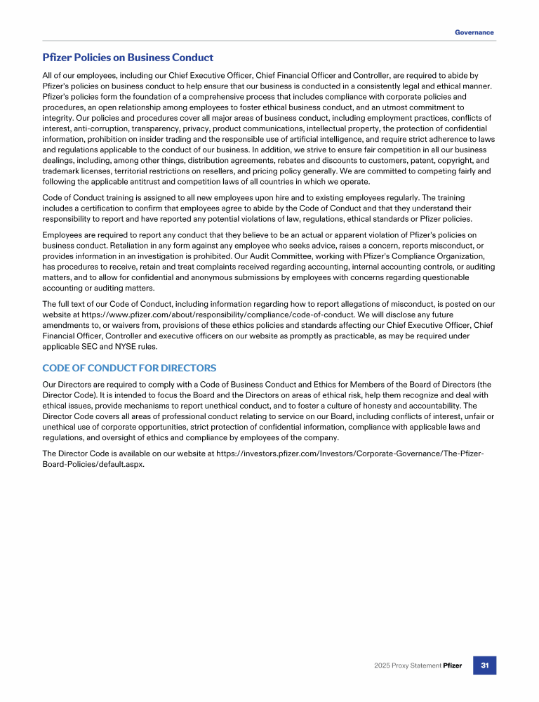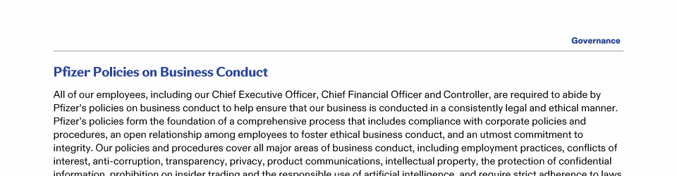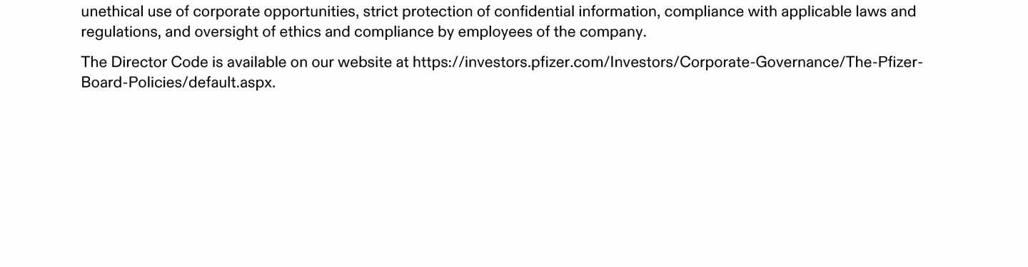 Click here to go to www.pfizer.com/about/responsibility/compliance/code-of-conduct Click here to go to www.pfizer.com/about/responsibility/compliance/code-of-conduct Click here to go to www.pfizer.com/about/responsibility/compliance/code-of-conduct Click here to go to investors.pfizer.com/Investors/Corporate-Governance/The-Pfizer-Board-Policies/default.aspx Click here to go to investors.pfizer.com/Investors/Corporate-Governance/The-Pfizer-Board-Policies/default.aspx Click here to go to investors.pfizer.com/Investors/Corporate-Governance/The-Pfizer-Board-Policies/default.aspx Click here to go to investors.pfizer.com/Investors/Corporate-Governance/The-Pfizer-Board-Policies/default.aspx Click here to go to investors.pfizer.com/Investors/Corporate-Governance/The-Pfizer-Board-Policies/default.aspx Click here to go to investors.pfizer.com/Investors/Corporate-Governance/The-Pfizer-Board-Policies/default.aspx Click here to go to www.pfizer.com/about/responsibility/compliance/code-of-conduct Click here to go to investors.pfizer.com/Investors/Corporate-Governance/The-Pfizer-Board-Policies/default.aspx Click here to go to investors.pfizer.com/Investors/Corporate-Governance/The-Pfizer-Board-Policies/default.aspx Click here to go to www.pfizer.com/about/responsibility/compliance/code-of-conduct Click here to go to investors.pfizer.com/Investors/Corporate-Governance/The-Pfizer-Board-Policies/default.aspx Click here to go to investors.pfizer.com/Investors/Corporate-Governance/The-Pfizer-Board-Policies/default.aspx